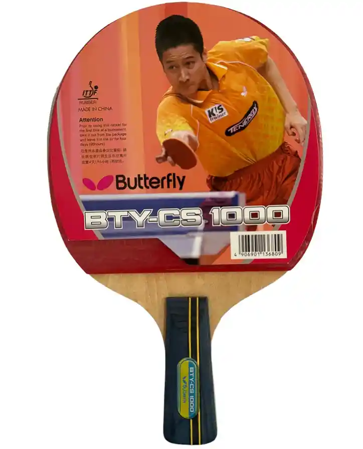 RAQUETA TENIS DE MESA BTY CS-1000 La raqueta de tenis de mesa Butterfly BTY CS-1000 está diseñada para jugadores recreativos en desarrollo que prefieren un agarre tipo bolígrafo (Penhold). Esta raqueta cuenta con una goma lisa en un lado y una esponja de 1,5 mm de grosor, ofreciendo un buen equilibrio entre velocidad y control. La construcción de cinco capas de madera laminada proporciona durabilidad y precisión en el juego. Esta raqueta es ideal para jugadores que buscan una combinación de velocidad, giro y control, permitiendo un juego agresivo sin sacrificar la precisión. CARACTERÍSTICAS: - Estilo de agarre: Penhold (tipo bolígrafo) - Material: Madera laminada de cinco capas - Goma: Lisa en un lado (Pan Asia roja o negra) - Esponja: 1,5mm de grosor - Dimensiones: 24 cm x 15 cm x 2,5 cm - Peso aproximado: 129g - Aprobaciones: Federación Internacional de Tenis de Mesa (ITTF) DISTRIBUIDOR AUTORIZADO Envíos a nivel nacional. ONE ZONE SPORT NIT: 901.451.888-6