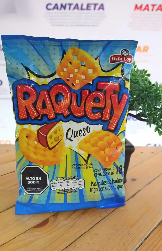 Es un snack salado, crujiente y con sabor a queso con forma de una pequeña raqueta. Presentación 18gr.