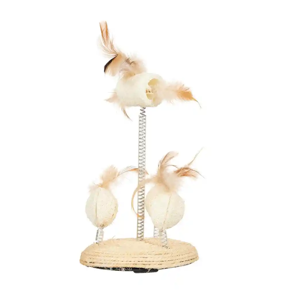 Juguete Rascador 2 en 1 con plumas, bolas móviles. Estimula el juego y cuida las uñas.