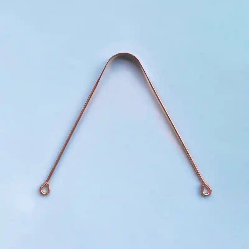 Viene empacado en bolsa de tela. Este raspador de lengua te ayuda a eliminar el mal aliento causado por la acumulación de bacterias y residuos en la lengua. Lo puedes usar todas las mañanas y pasarlo entre 3 y 5 veces. Material: Cobre.