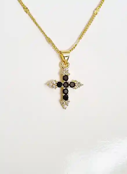 Cadena dije cruz rodio dorado con enchape en oro de 18k y circones negros. Cadena 45cms largo con extensión