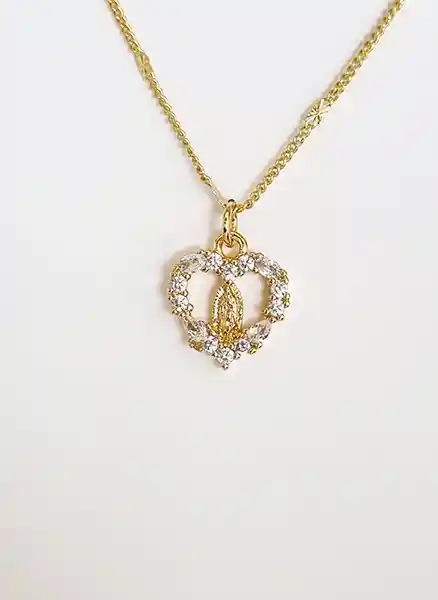 Cadena dije virgen Guadalupe corazón brillante rodio con enchape en oro de 18K y circones brillantes. Cadena 45cms extensible