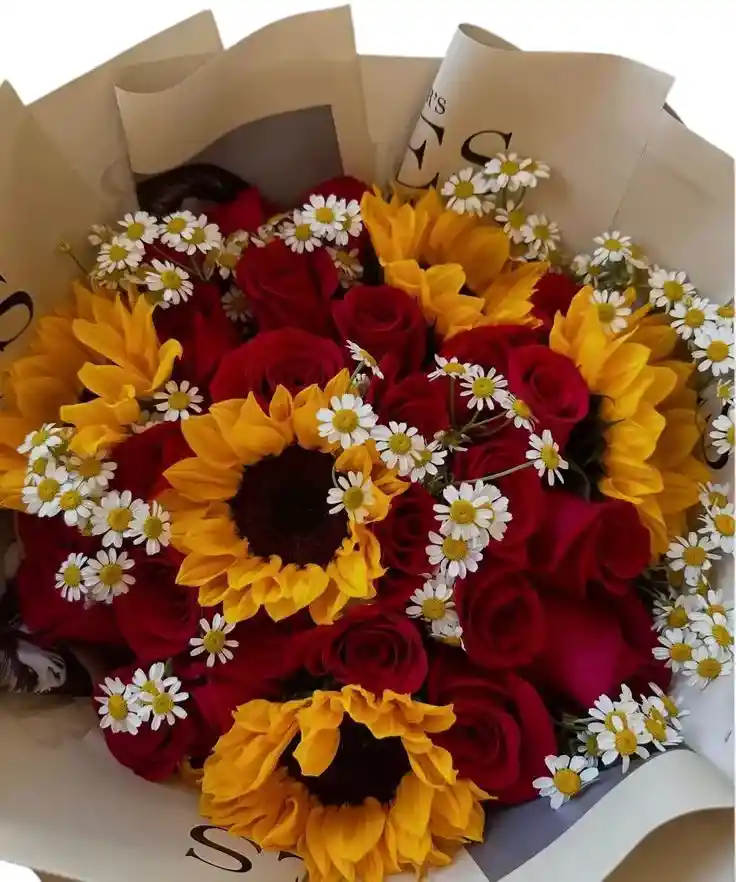 Bouquet de 24 rosas con 5 girasoles y margarita blanca mini Nota: La flor puede ser sustituida dependiendo la disponibilidad de color y del producto “Mensaje Personalizado” máximo de 30 caracteres (Dejar el mensaje en el chat, los comentarios no se previsualizan para la tienda por lo que si se dejan allí no podrá ser incluido).