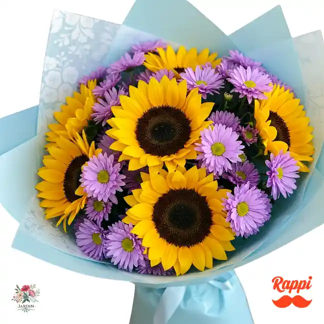 Rayos de Sol Lila captura la esencia de un jardín encantado donde la alegría del sol se fusiona con la delicadeza de la lavanda. Seis vibrantes girasoles, como pequeños soles radiantes, irradian calidez y optimismo. Diez tallos de margaritas moradas, con sus pétalos suaves y su color misterioso y elegante, crean un hermoso contraste que añade un toque de magia y sofisticación.