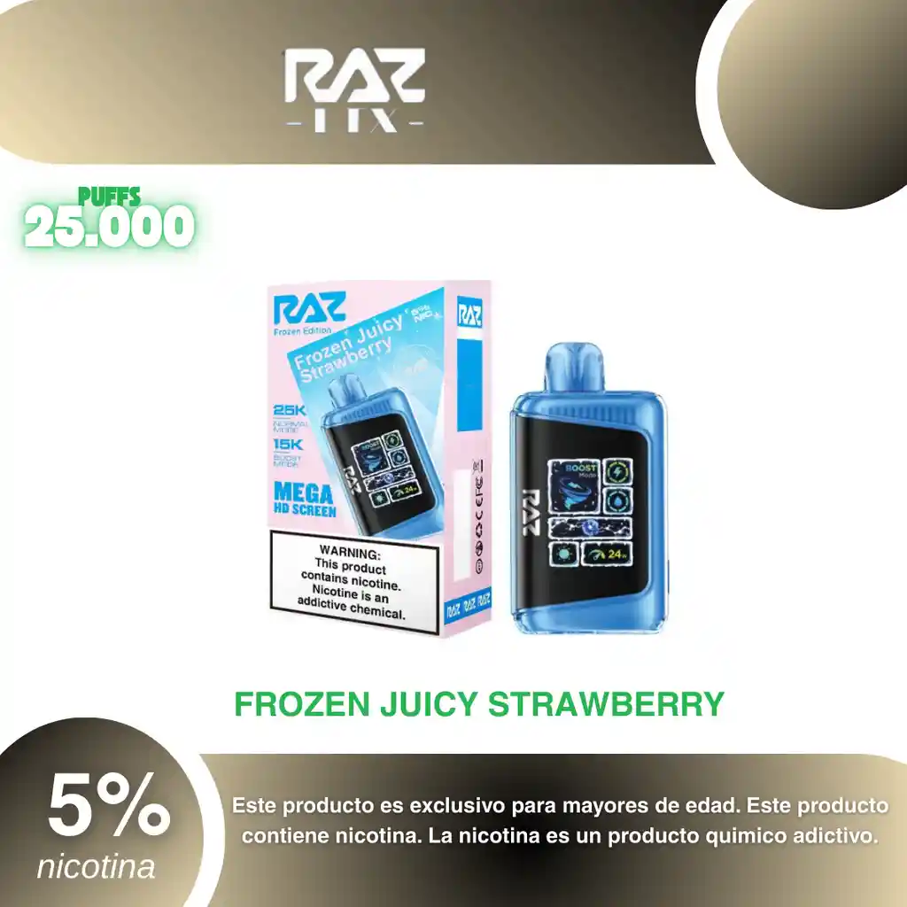 Raz Ltx 25.000 Puffs, Sabor Fresa Mentolada 5% PROHIBIDA LA VENTA A MENORES DE EDAD. ADVERTENCIA: ESTE PRODUCTO CONTIENE NICOTINA, LA NICOTINA ES UNA SUSTANCIA QUIMICA ADICTIVA Y NOCIVA PARA LA SALUD. Los líquidos para vapeo contienen: propilenglicol USP, glicerina USP, sabor artificial y nicotina. Este producto puede contener nicotina, una sustancia altamente adictiva que puede generar dependencia, posibles afectaciones arteriales, cardiacas, pulmonares y otras aun no identificadas. No se recomienda su uso a mujeres en embarazo, puede generar lesiones al feto. Mantener alejado de niños y mascotas. No ingerir, puede generar irritación y/o intoxicación. Por favor antes de consumir consulte a su médico posibles afectaciones o sensibilidad a alguno de sus componentes. Los componentes de este producto pueden aumentar la sensación de ansiedad En caso de notar alguna reacción adversa por favor suspenda su uso de manera inmediata. Siga las instrucciones en el envase. No alterar sus componentes. Adquiera sus productos en sitios de confianza No use productos piratas, alterados, o en los cuales no pueda comprobar su buena procedencia, Verifique la reputación del fabricante y distribuidor antes de adquirir cualquier producto Si no es usuario fumador o vapeador no se recomienda su uso bajo ninguna circunstancia Al usar este producto usted es consciente que este producto puede generar afectaciones a su salud, incluyendo aquellas que a la fecha de la compra no se han identificado y que pueden aparecer a largo plazo