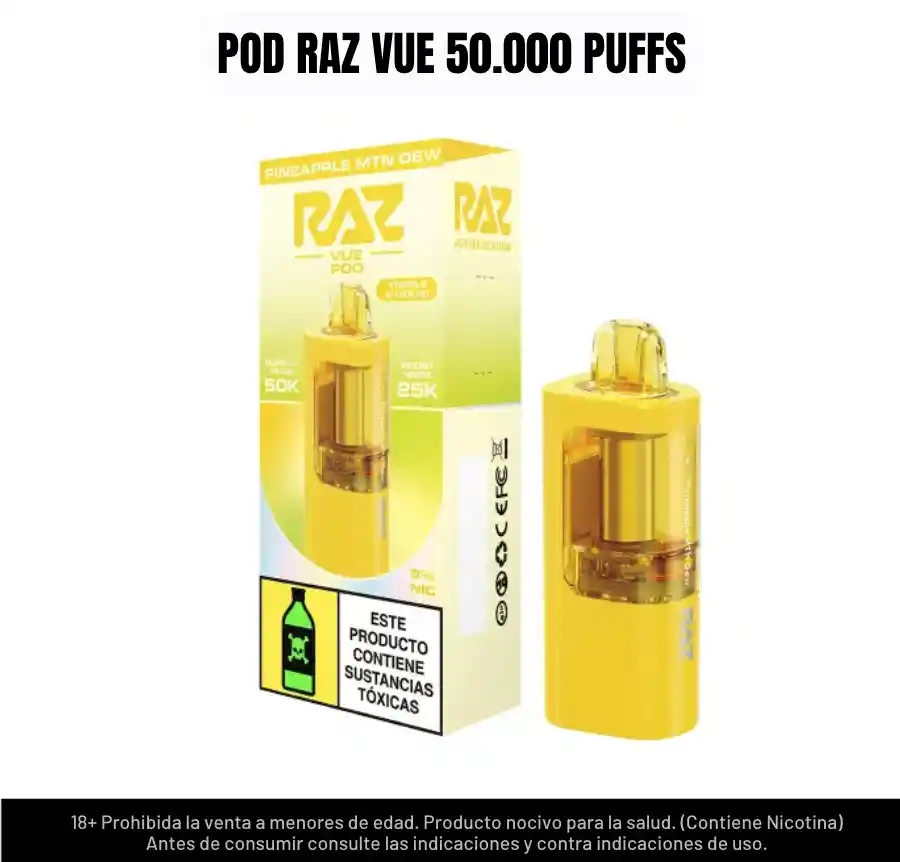 SODA DE PIÑA - Recarga para dispositivo Raz Vue 50.000 Puffs. 5% nicotina. Prohibida su venta a menores de edad, contiene nicotina.