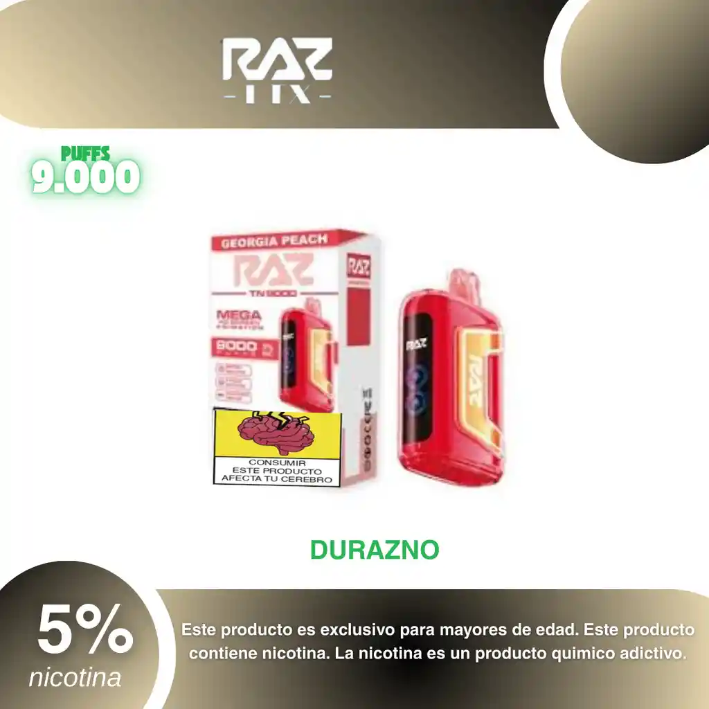 Raz Tn 9.000 Puffs, Sabor Durazno 5% PROHIBIDA LA VENTA A MENORES DE EDAD. ADVERTENCIA: ESTE PRODUCTO CONTIENE NICOTINA, LA NICOTINA ES UNA SUSTANCIA QUIMICA ADICTIVA Y NOCIVA PARA LA SALUD. Los líquidos para vapeo contienen: propilenglicol USP, glicerina USP, sabor artificial y nicotina. Este producto puede contener nicotina, una sustancia altamente adictiva que puede generar dependencia, posibles afectaciones arteriales, cardiacas, pulmonares y otras aun no identificadas. No se recomienda su uso a mujeres en embarazo, puede generar lesiones al feto. Mantener alejado de niños y mascotas. No ingerir, puede generar irritación y/o intoxicación. Por favor antes de consumir consulte a su médico posibles afectaciones o sensibilidad a alguno de sus componentes. Los componentes de este producto pueden aumentar la sensación de ansiedad En caso de notar alguna reacción adversa por favor suspenda su uso de manera inmediata. Siga las instrucciones en el envase. No alterar sus componentes. Adquiera sus productos en sitios de confianza No use productos piratas, alterados, o en los cuales no pueda comprobar su buena procedencia, Verifique la reputación del fabricante y distribuidor antes de adquirir cualquier producto Si no es usuario fumador o vapeador no se recomienda su uso bajo ninguna circunstancia Al usar este producto usted es consciente que este producto puede generar afectaciones a su salud, incluyendo aquellas que a la fecha de la compra no se han identificado y que pueden aparecer a largo plazo