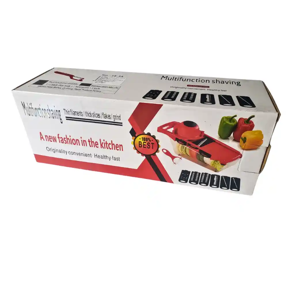 Producto nuevo y de alta calidad Fabricado con acero inoxidable y plástico Ideal para uso diario, con diseño robusto y duradero Equipado con pies de goma antideslizantes para una excelente estabilidad durante su uso Fácil de limpiar con un ligero enjuague bajo agua Material: acero inoxidable y plástico Color: rojo Paquete incluye: 1 base de rebanador roja 1 caja de almacenamiento 6 tablas cortadoras 1 pelador