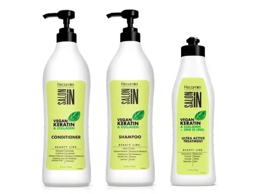 KIT VEGANO RECAMIER: Shampoo + Acondicionador + Tratamiento Semilla de lino CONTIENE: - Shampoo vegano litro - Acondicionador vegano litro - Tratamiento Semilla lino 500ml 1. KERATIN HAIR SHAMPOO Presentación: 1000 mL Limpia y recupera la hidratación del cabello. Nutre y fortalece la fibra capilar y deja el cabello limpio, hidratado, sano, fuerte, suave y brillante. Producto vegano. No testeado en animales. *Sin adición de Parabenos, Siliconas, y Sal (Cloruro de Sodio). 2. KERATIN HAIR ACONDICIONADOR Presentación: 1000 mL Desenreda, acondiciona y recupera la hidratación del cabello. Nutre y fortalece la fibra capilar y deja el cabello desenredado, acondicionado, hidratado, sano, fuerte, suave y brillante. Producto vegano. No testeado en animales. 3. TRATAMIENTO ULTRA ACTIVE RECAMIER VEGAN KERATIN COLLAGEN + SEMI DI LINO Contiene: 500ml Descripcion: Tratamiento que ayuda a reestructurar el cabello de manera intensiva, desarrollado especialmente para , rescatar y revitalizar cabellos extremadamente secos, deshidratados, dañados, débiles o con procesos químico. Modo de uso: Aplicar sobre cabello limpio y humedo de medios a puntas. Masajear. Dejar actuar de 2 a 5 min. Enjuague.