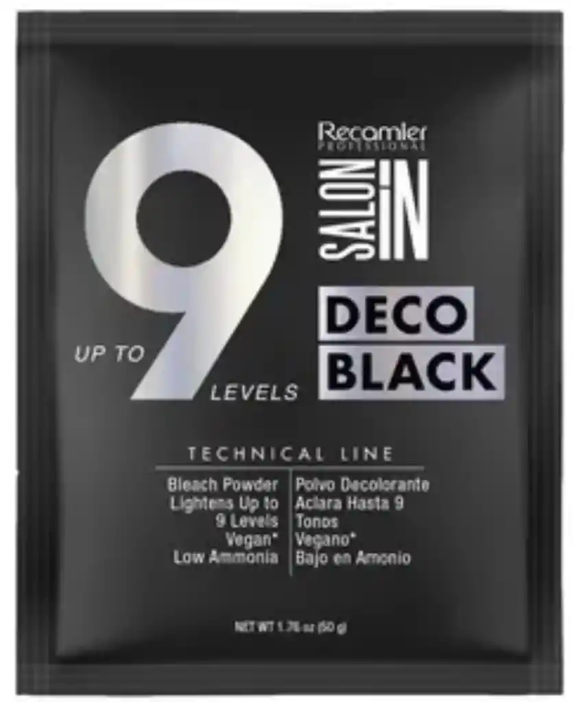 Sachet salon in recamier polvo decolorante deco black *50g. Polvo decolorante gris. Al mezclarse con el revelador, adquiere una consistencia tipo mascarilla. Enriquecido con ingredientes acondicionadores, protege tanto el cuero cabelludo como la fibra capilar. Ideal para todo tipo de técnicas de decoloración (mechas, balayage o extracciongi de color). Mantiene el Cabello suave, brillante y saludable. 100% vegano.