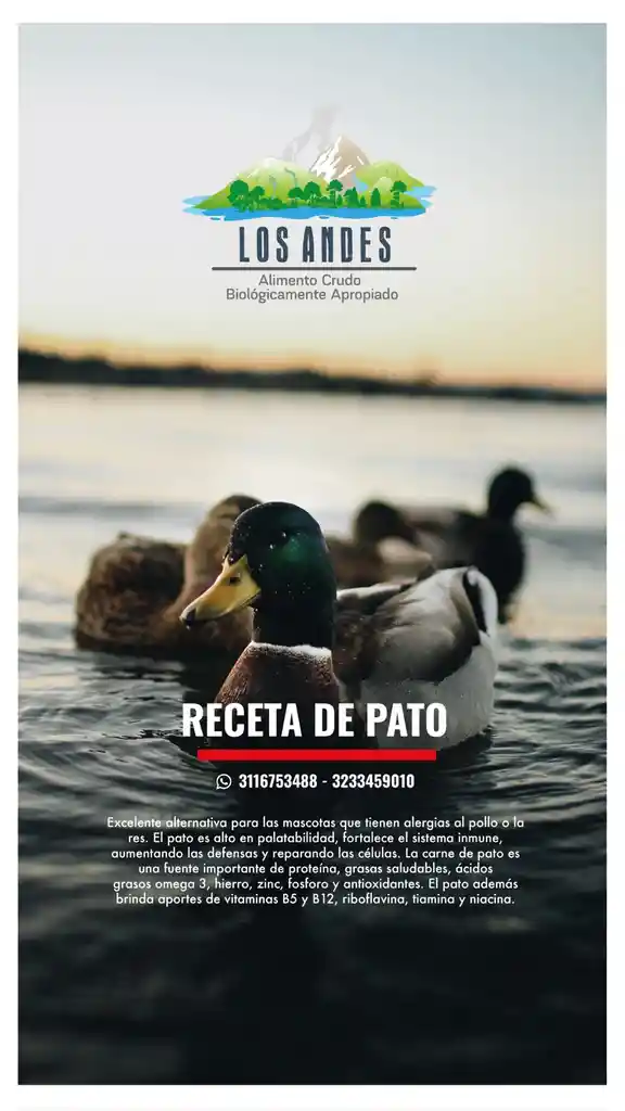 Excelente alternativa para las mascotas que tienen alergia al pollo o la res. El pato es alto en palatabilidad, fortalece el sistema inmune y repara las células. Esta ave es una fuente importante de proteína, grasas saludables, ácidos grasos omega 3, hierro, zinc, fosforo y antioxidantes. Además, brinda aportes de vitaminas B5 y B12, riboflavina, tiamina y niacina.