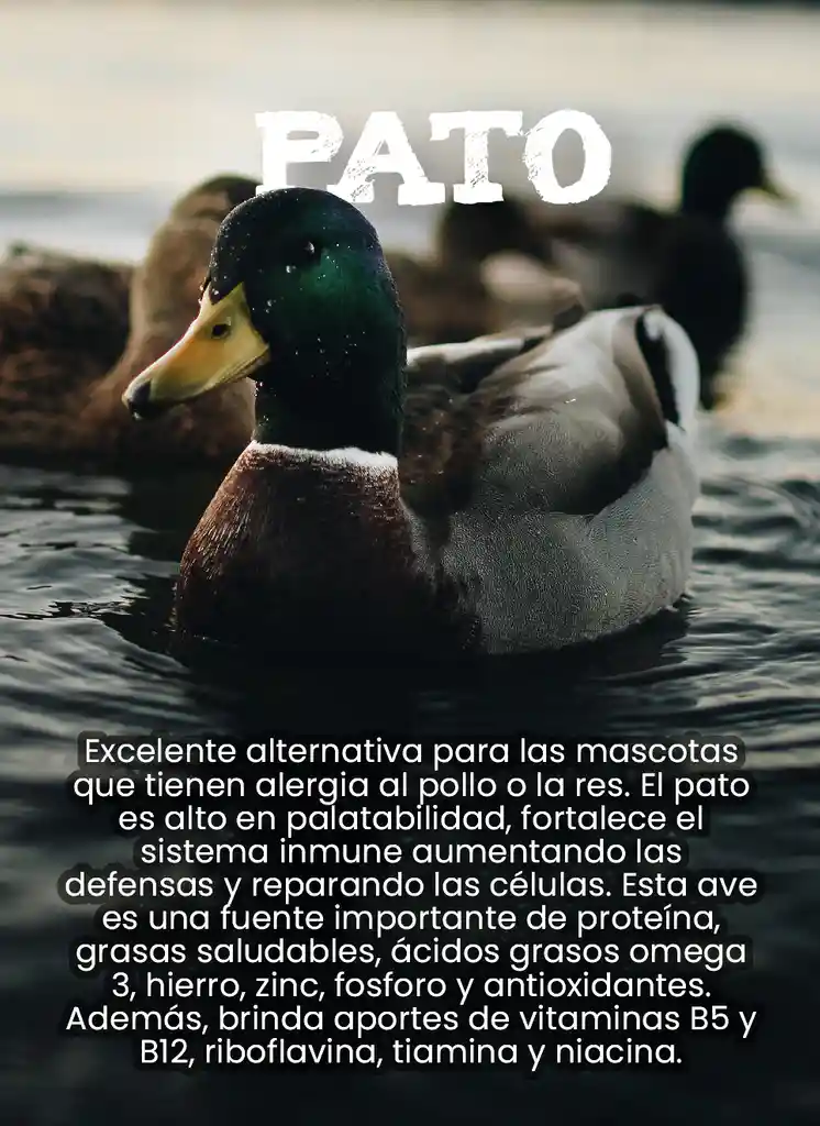 Excelente alternativa para las mascotas que tienen alergia al pollo o la res. El pato es alto en palatabilidad, fortalece el sistema inmune y repara las células. Esta ave es una fuente importante de proteína, grasas saludables, ácidos grasos omega 3, hierro, zinc, fosforo y antioxidantes. Además, brinda aportes de vitaminas B5 y B12, riboflavina, tiamina y niacina.