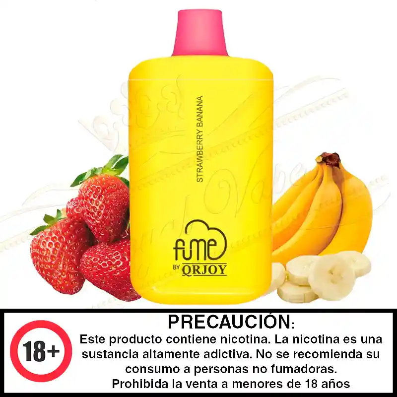Dispositivo de vapeo desechable 5,000 puff nicotina: 5% - 50mg por ml Sabor Fresa banana. Ingredientes: Glicerina vegetal, Propilenglicol, nicotina y saborizantes artificiales ADVERTENCIA Este producto contiene nicotina, una sustancia muy adictiva. No debe ser usado por mujeres embarazadas o personas con problemas respiratorios, no se recomienda su uso a no fumadores, mantener fuera del alcance de niños y mascotas, en caso de accidente consulte a su médico. Recuerda si no fumas no vepees Vapear no es un juego ni una moda. Prohibida su venta a menores de edad. ESTE PRODUCTO PUEDE SER PELIGROSO Y PERJUDICIAL PARA LA SALUD. Prohibida la venta a menores de edad. Producto nocivo para la salud que contiene nicotina, sustancia altamente adictiva. Antes de consumir consulte las indicaciones y contraindicaciones de uso