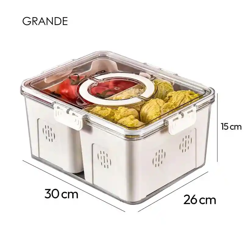 Mantén tu refrigerador en orden y tus frutas frescas con estos compartimentos para organizar tus alimentos. Su tapa con cierre hermético mantendrá tus frutas y verduras siempre frescas y seguras. Es fácil de limpiar y tiene un sistema de drenaje por si tus frutas están en agua o las vas a lavar. ¡Tu nevera y tus frutas siempre estarán ordenadas! CARACTERÍSTICAS: Tapa de Cierre Hermético: Mantiene la frescura y evita la mezcla de olores. Transporte: Cuenta con un mango resistente en su tapa para que puedas llevarlo donde quieras. Organización Perfecta: Cada caja cuenta con más compartimentos para que puedas guardar todas tus frutas y verduras. Ahorro de Espacio: Diseño compacto maximiza el espacio en tu refrigerador. medias 31x24x14.5 cm
