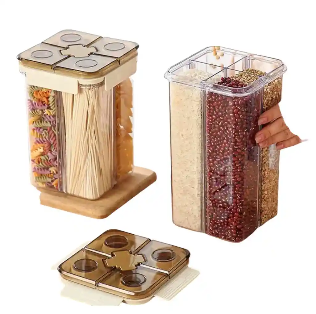 Mantén tus granos, pastas y cereales siempre frescos con este práctico recipiente hermético de 4 compartimentos. Su diseño con cierre en 4 lados y anillo de silicona asegura un sellado perfecto, ideal para organizar tu cocina con estilo y funcionalidad. Medidas: 20 cm de alto x 14cm de ancho x 14cm de fondo