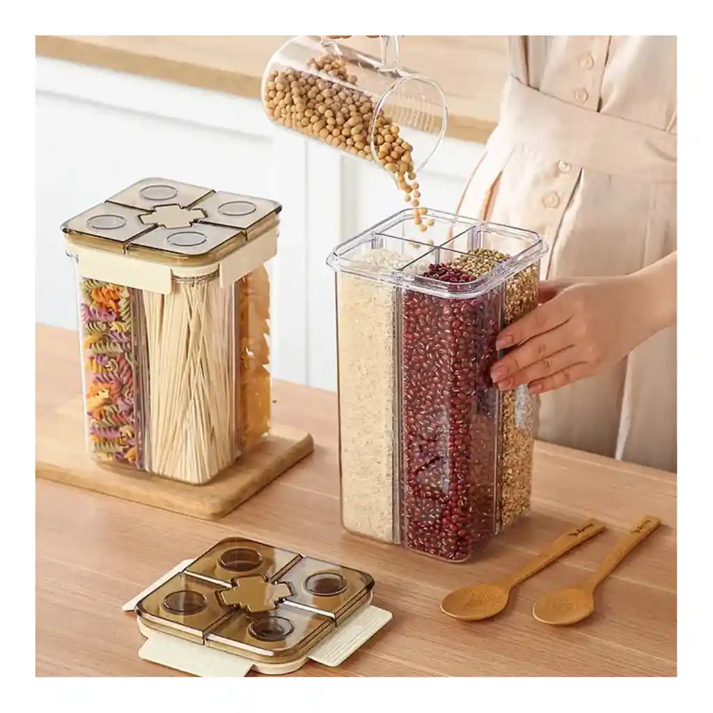 Mantén tus granos, pastas y cereales siempre frescos con este práctico recipiente hermético de 4 compartimentos. Su diseño con cierre en 4 lados y anillo de silicona asegura un sellado perfecto, ideal para organizar tu cocina con estilo y funcionalidad. Medidas: 20 cm de alto x 14cm de ancho x 14cm de fondo