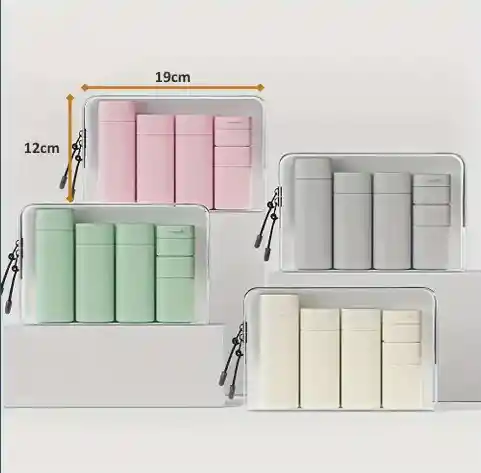 Descripción general La imagen muestra un estuche organizador portátil con frascos recargables, ideal para viajes, uso diario o llevar en el bolso. Está diseñado para transportar líquidos y productos de cuidado personal de forma ordenada, segura y compacta. Diseño y materiales Estuche rectangular y transparente, que permite ver el contenido fácilmente. Fabricado en material resistente y ligero, con bordes reforzados. Incluye cierre de cremallera con tirador, que asegura los frascos durante el transporte. Diseño moderno y minimalista. Contenido interno Cada estuche incluye varios envases reutilizables, de diferentes tamaños, ideales para: Shampoo Acondicionador Cremas Lociones Gel, sérum o productos cosméticos líquidos Los frascos están perfectamente ajustados para evitar movimientos y derrames. Dimensiones Largo: 19 cm Alto: 12 cm Tamaño compacto, compatible con equipaje de mano. Colores disponibles Se muestran varias opciones de color para los frascos internos: Rosa Verde menta Gris Beige / crema (Cada color se vende por separado, según disponibilidad) Impresión general Este organizador de viaje combina practicidad, orden y estilo, siendo una excelente opción para personas que buscan llevar sus productos personales de manera higiénica y organizada. Ideal para viajes, gimnasio, oficina o uso diario.