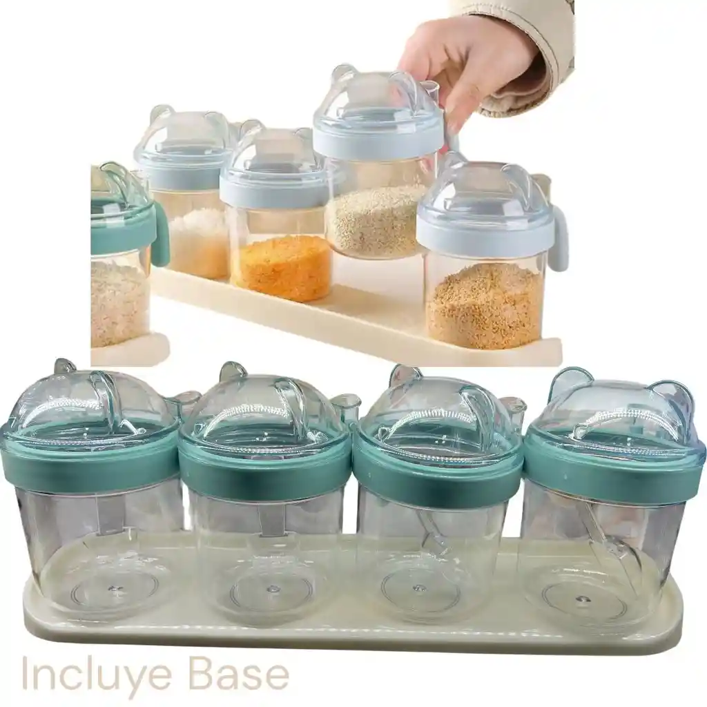 4 Recipientes mas base ,ideal para mantener su cocina y espacios organizados,son la mejor obsesión para azucar,sal,condimentos. Material plastico .