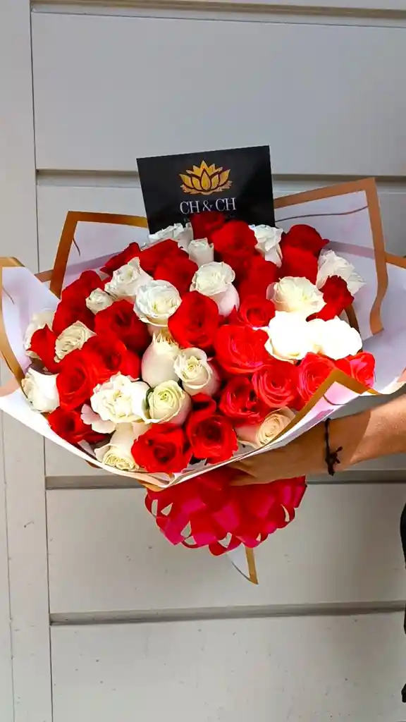Este precioso y elegante ramo floral te incluye: 50 rosas, tarjeta impresa con mensaje personalizado, papel y moño decorativos