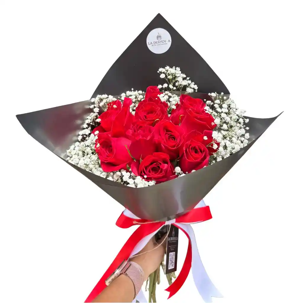 Ramo de 12 rosas rojas con gypsofilia, envuelto en papel mate (puede variar el color) y moño doble en cinta satinada. Diseño elegante, ideal para ocasiones especiales