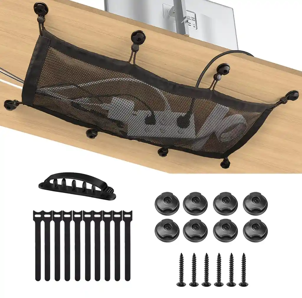 Kit de gestión de cables: recibirás 2 redes de gestión de cables, equipadas con 2 organizadores de cables de silicona de 5 agujeros, 20 bridas con cierres de gancho y bucle, así como 6 tornillos y 6 ganchos; este kit de gestión de cables proporciona suficiente espacio para almacenar tus fuentes de alimentación, enchufes y enchufes; puedes ocultar el cable y mantener el escritorio ordenado Tamaño ideal: la red de cable es de aproximadamente 27 pulgadas de largo y 9 pulgadas de ancho, tamaño compacto que se adapta a la mayoría de escritorios; mide el tamaño cuidadosamente antes de comprar para evitar una experiencia de compra desagradable Gestión de cables de malla ajustable y fácil de instalar: puedes ampliar la distancia entre cada soporte para adaptarse perfectamente a la mesa de acuerdo a tus necesidades reales; te proporcionamos 6 tornillos y 6 ganchos para evitar el riesgo de que los cables se caigan Malla de poliéster ignífuga: debido al material de poliéster de calidad, el organizador de alambre debajo del escritorio puede disipar el calor uniformemente, por lo que tus cables electrónicos y enchufes pueden estar muy bien protegidos; los bordes finamente envueltos y la rejilla firme proporcionan una experiencia satisfactoria de almacenamiento de alambre colgante para mejorar la eficiencia de la oficina Aplicación versátil: la gestión de cables debajo del escritorio es ideal para organizar cables de red, cables de cable, cables de carga, cables de alimentación, cables de audio, cables de video, etc. Consejos: este producto solo se adapta a mesas que permiten perforar agujeros, no apto para mesas de vidrio, pizarra y metal