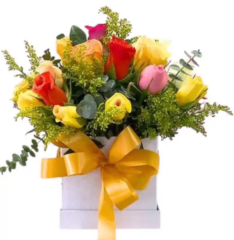 ARREGLO REDONDO CON ROSAS SURTIDAS , FOLOLAJES , CAJA BLANCA MOÑO , TERJETA PERSONALIZADA
