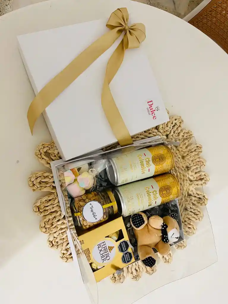 Linda Cajita con mini Osito de peluche con corbatín, Mix de frutos secos, 2 cervezas Club Colombia doradas, Masmelos y gomitas. Tarjeta Feliz día del hombre.