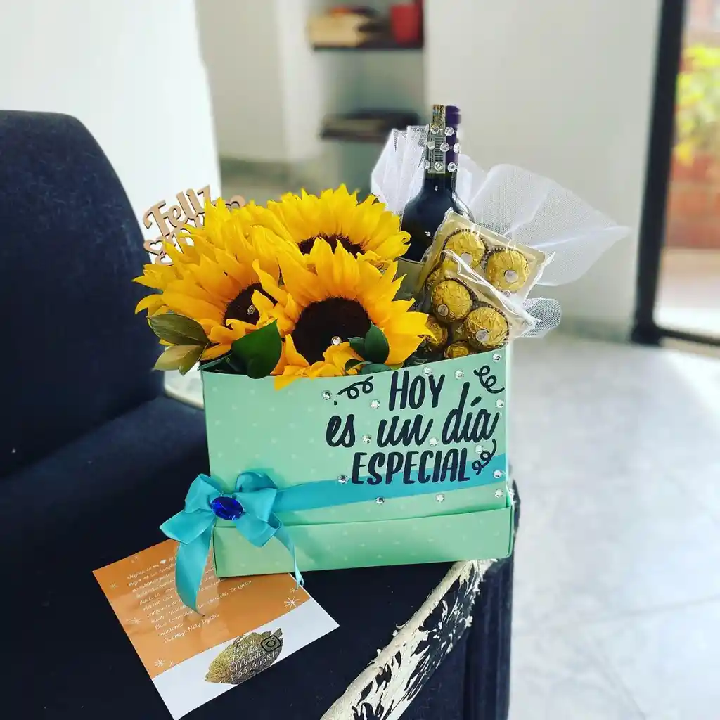 Caja en flores exóticas, chocolates ferrero, vino, decoración y tarjeta. (Los tonos y la ocasión del producto son a elección del cliente, cada producto tiene un diseño personalizado y exclusivo)