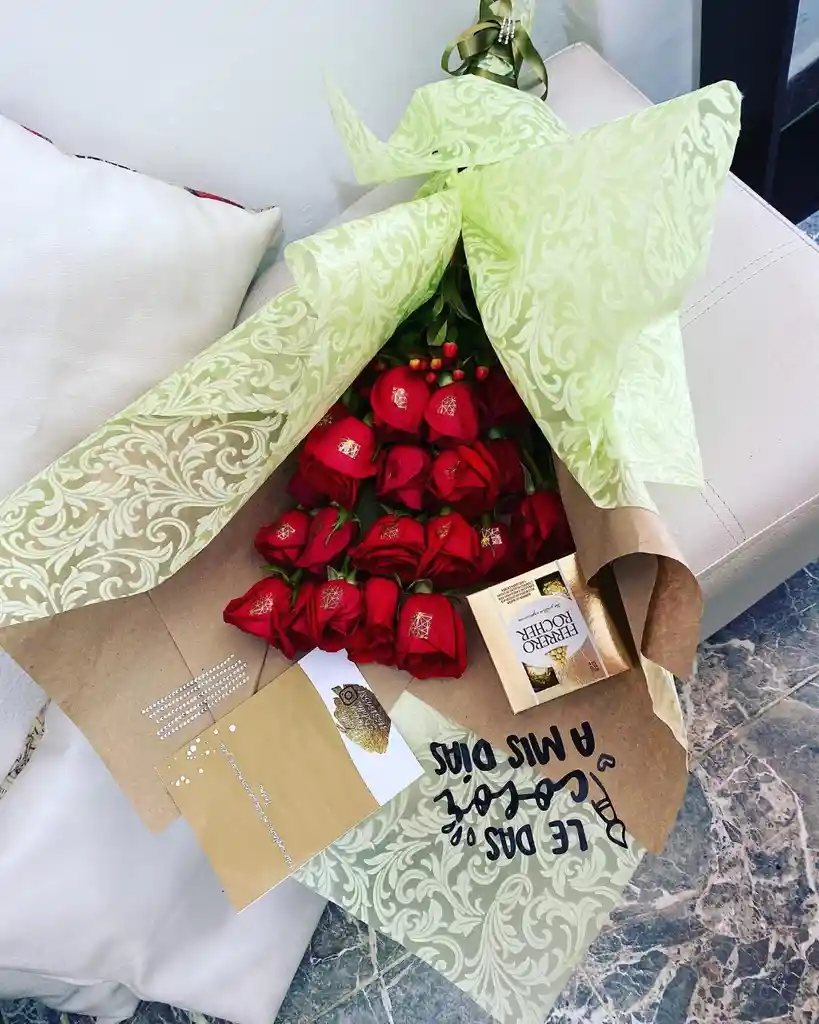 Ramillete 24 rosas, chocolates ferrero, decoración y tarjeta. (Los tonos y la ocasión del producto son a elección del cliente, cada producto tiene un diseño personalizado y exclusivo)