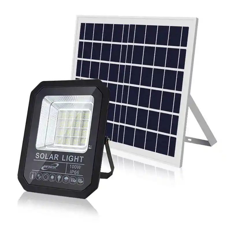 El Reflector Solar Infinita de 100 watts luz blanca, te brinda una gran cantidad de horas de duración, máxima calidad y potencia de iluminación, ahorro 100% de energía ya que funciona únicamente con energía solar y una buena distribución uniforme de la luz. Ideal para utilizarlo en exteriores, o zonas interiores amplias, resistente al agua, polvo e intemperie.