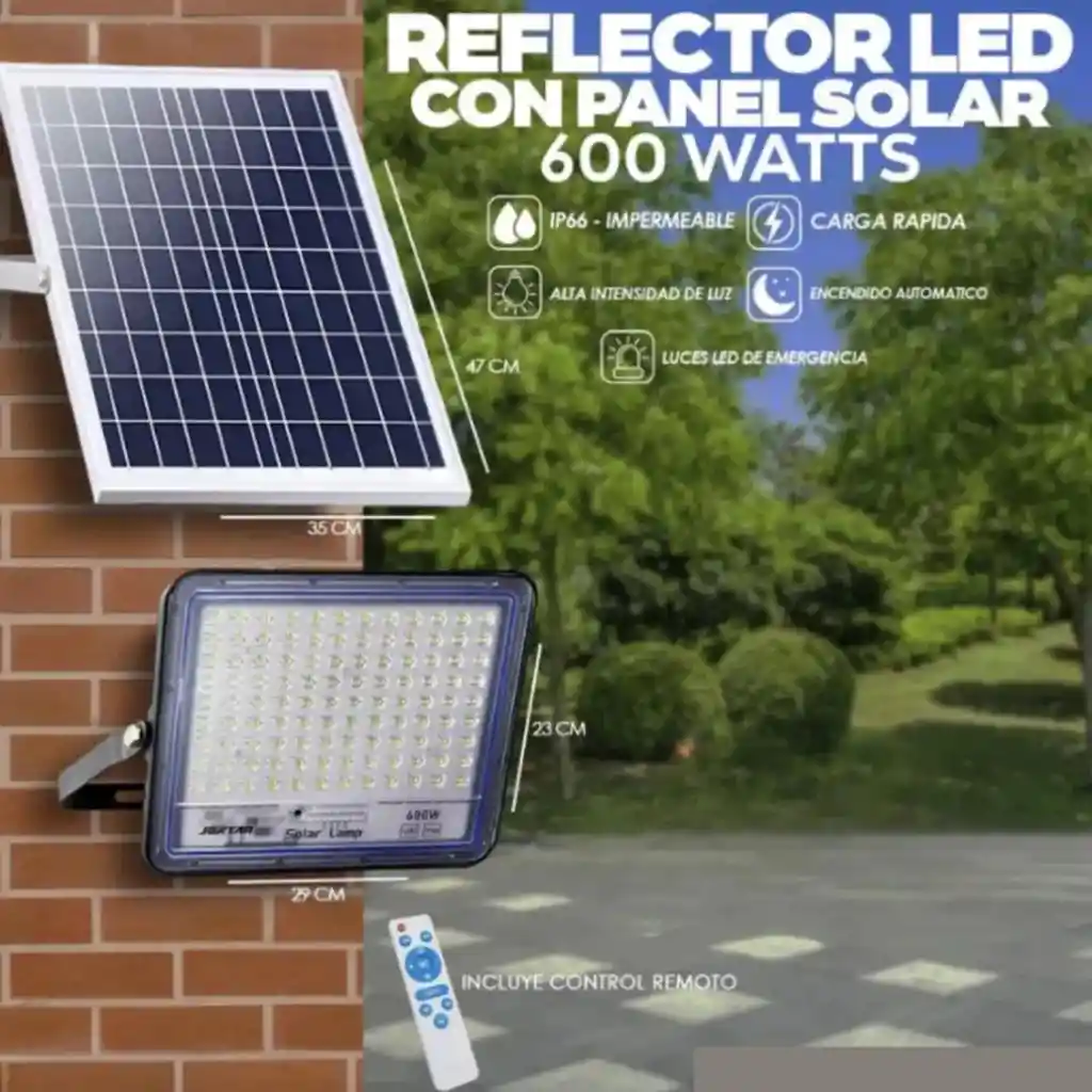 Proyector solar LED de 600 Watt con panel fotovoltaico y Mando a distancia Tipo de color: Blanco Frío 6500 lm Potencia: 600 vatios Lúmenes: 1300ml Autonomía: 10~12 Horas Sensor de luz Protección del agua: IP66 Material de construcción: Aluminio Control remoto inalámbrico Baterías de alta calidad con gran capacidad. Fácil instalación sin cables. Difusión de la luz: 100 grados Dimensiones del panel: 48 x 36 x 2 cm Dimensiones del proyector: 29 x 23 x 6 cm Peso: 5.630 kilos. Incluye * 1 Foco de 600W. * 1 Panel solar. * 1 Control remoto. * 2 Pilas AAA (triple A). * 1 Bolsa con pernos.