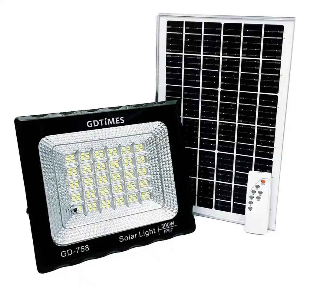¡Ideal para jardines, patios, caminos, zonas sin energía eléctrica, camping, entre otros! Lámpara solar led para exterior, carga durante el día e ilumina toda una noche, resistente al agua y todo clima. CARACTERÍSTICAS: - Panel Solar 6v 12W - Marca: GD Times -Tiempo de trabajo: aproximadamente 4-5h dependiendo condiciones de carga y factores ambientales en la zona instalada. - Reflector LED 300W - Batería de litio recargable - No necesita instalación eléctrica o cableado - Control remoto incluido para fácil manipulación el cual cuenta con 3 modos de tiempo de uso del reflector 3 h, 5h, 8 horas - Con sensor de luz - Luz blanca fría - Cuenta con la opción de manejar la potencia de luz del reflector - Dimensiones aproximadas del reflector 22 x 8 x 25 cm - Dimensiones aproximadas del panel solar 35 x 1.5 x 23 cm - Largo aproximado del cable que une el reflector con el panel solar 250 cm - Tiempo de carga 8-10 horas TE ENTREGAMOS: 1 - Lampara reflector exterior solar LED de 300 W 1 - Panel solar 1 - Control remoto
