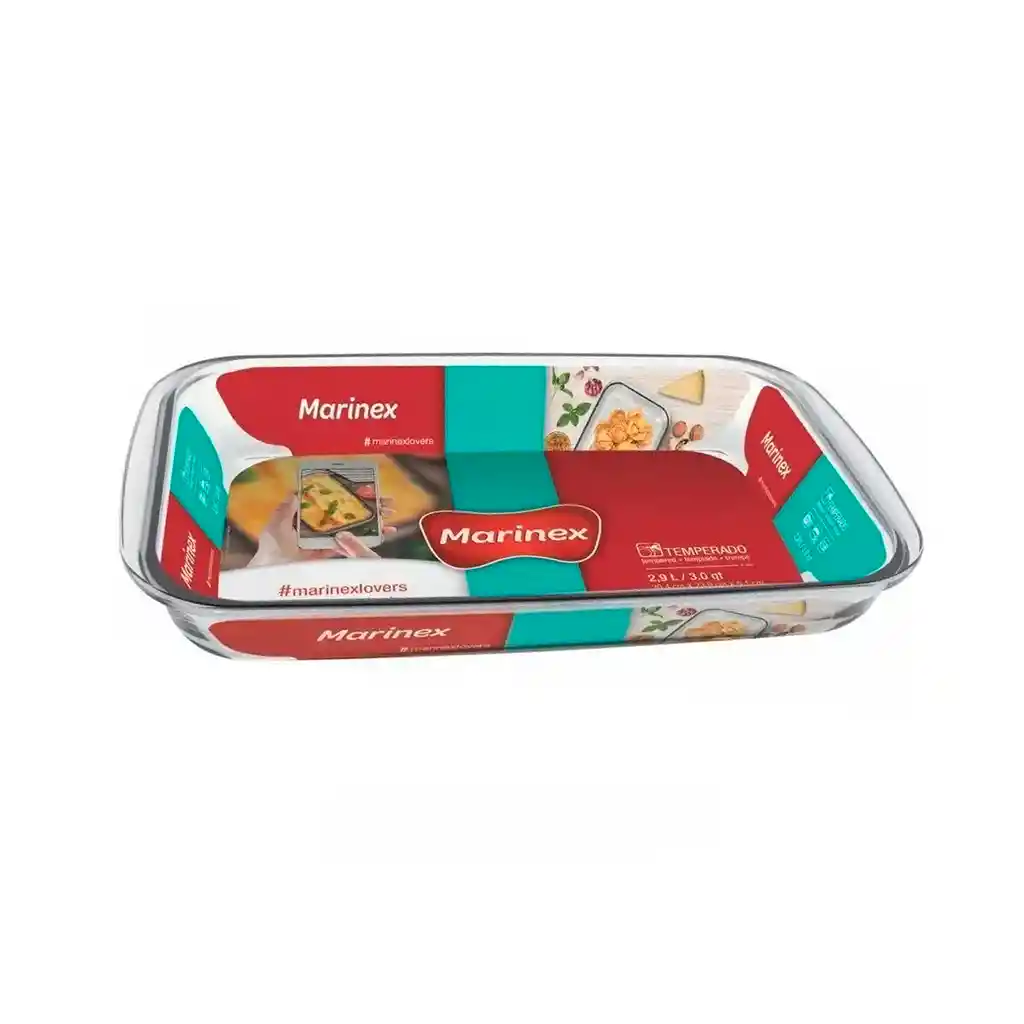 Volumen de 2.9 litros (3.0 qt), ideal para preparar lasañas, carnes asadas o postres de tamaño mediano. Fabricada en vidrio templado de la marca Marinex, garantizando resistencia y durabilidad. Apta para uso seguro en horno convencional, microondas, congelador y lavavajillas. Forma rectangular con bordes redondeados que facilitan el agarre y la manipulación segura. Superficie de vidrio no porosa que no absorbe olores, manchas ni sabores de los alimentos. Su transparencia cristalina permite llevar las preparaciones directamente del horno a la mesa. Material libre de BPA y químicos, ideal para una cocina segura y libre de contaminantes. Su diseño permite optimizar el espacio en la nevera o alacena al guardar tus preparaciones. Producto diseñado para soportar el uso diario intenso manteniendo su brillo origina. Se recomienda evitar el contacto directo con superficies frías cuando la refractaria esté caliente para prevenir choques térmicos. Se entrega en un empaque protegido para asegurar que la pieza llegue en perfectas condiciones hasta la puerta de tu hogar.. Estos productos han sido ambientados, los accesorios adicionales no están incluidos y su color puede variar por la luz.. . .