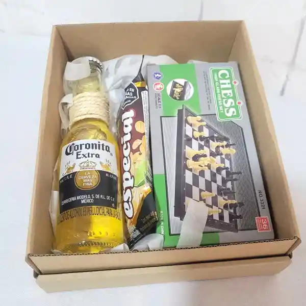UNA CAJITA IDEAL PARA TODA OCASIÓN QUE CONTIENE: - 1 JUEGO DE AJEDREZ CON PIEZAS IMANTADAS - 1 CERVEZA CORONITA - 1 MANI LA ESPECIAL - TARJETA NOTA: ALGUNOS PRODUCTOS PUEDEN VARIAR SEGUN DISPONIBILIDAD DE LA TIENDA