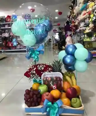 Ancheta Saludable con Frutas (fresa, manzana, pera, banano, granadilla, uvas) Rosas natuales, globo burbuja personalizado, arbolito en globo pequeño, colores sujeto a cambio.