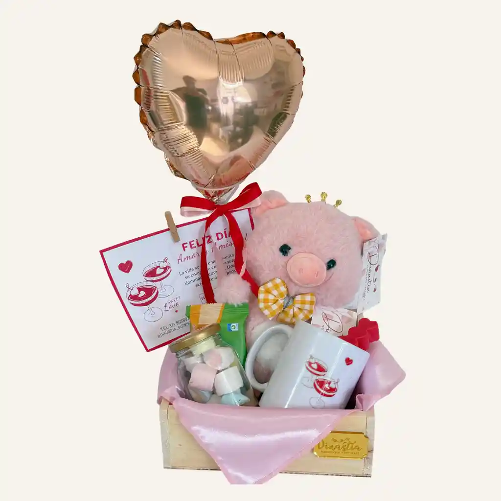 Hermosa Ancheta para mujer , peluche, mug, vela con aroma, galletas tosh, envase chocolate y másmelos, globo corazón, tarjeta y decoración rosada y roja.