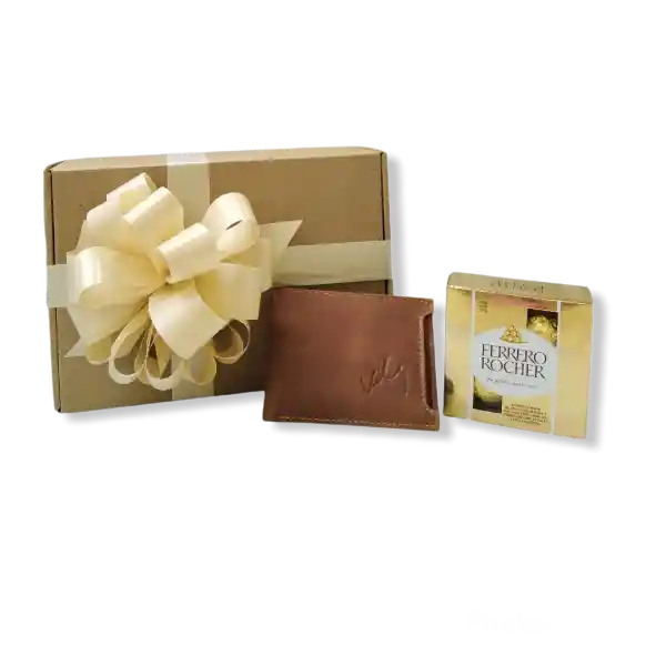 Regalo Billetera box , 100% Cuero Triple A Premium, Marca Velez, Chocolate Ferrero x 4 -50g. Cajacarton microcorrugado, cinta, moño y tarjeta básica.