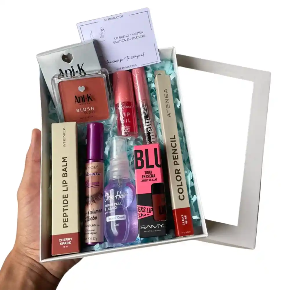 Esta es una caja que se compone tanto de maquillaje (blush, lip oil, gel para cejas, lip balm, lápiz, pestañina y tinta cremosa) como de un perfume capilar. Algunos productos pueden variar de color y aroma, pero es de la misma línea.