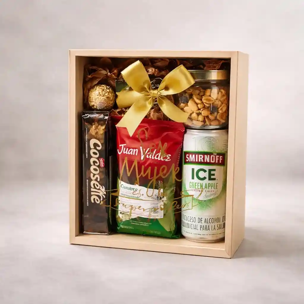 Incluye Caja madera edición día de la mujer Smirnoff Cafe Juan Valdez Ferrero x 3 Frasco Maní Cocosette