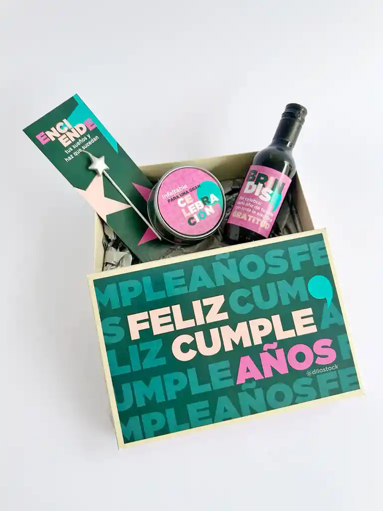 Caja de cumpleaños para sorprender a alguien especial contiene una piba de vino, torta envinada en lata y vela de estrella. cuando confirmos te pedido nos comunicaremos contigo en caso de que necesites tarjeta de para