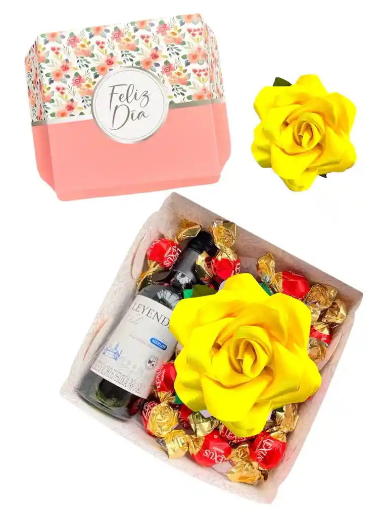 Regalo Caja vino, chcolates y flores amarillas rosa eterna