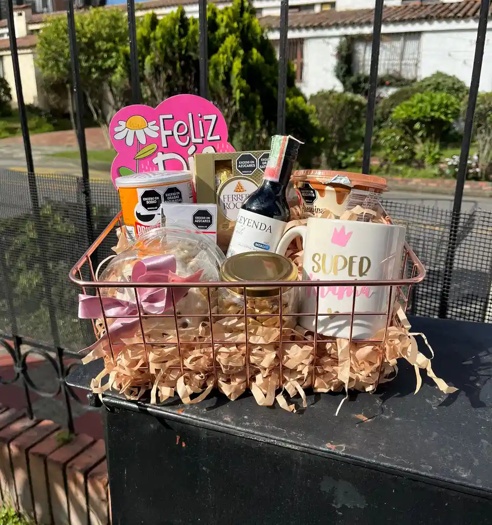 Inlcluye: Mug super Mamá, Frasco maní, Torta personal, Vino leyenda 187 ml, Arequipe, Almendras, Pringles y Ferrero x 4