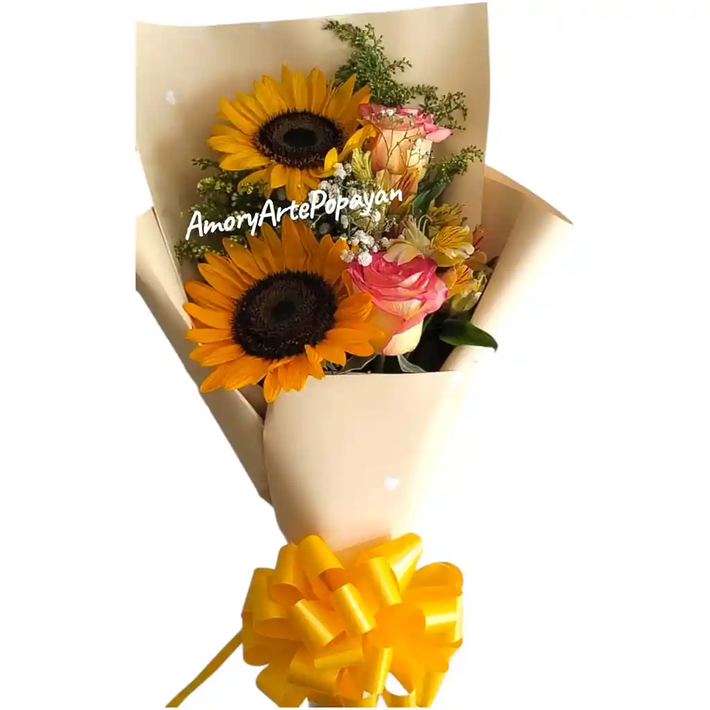 HERMOSO DETALLE FLORAL CON ROSAS,GIRASOLESY ASTROMELIAS,CON ENVOLTURA DE PAPEL COREANO Y MOÑO EN CINTA DE PAPEL