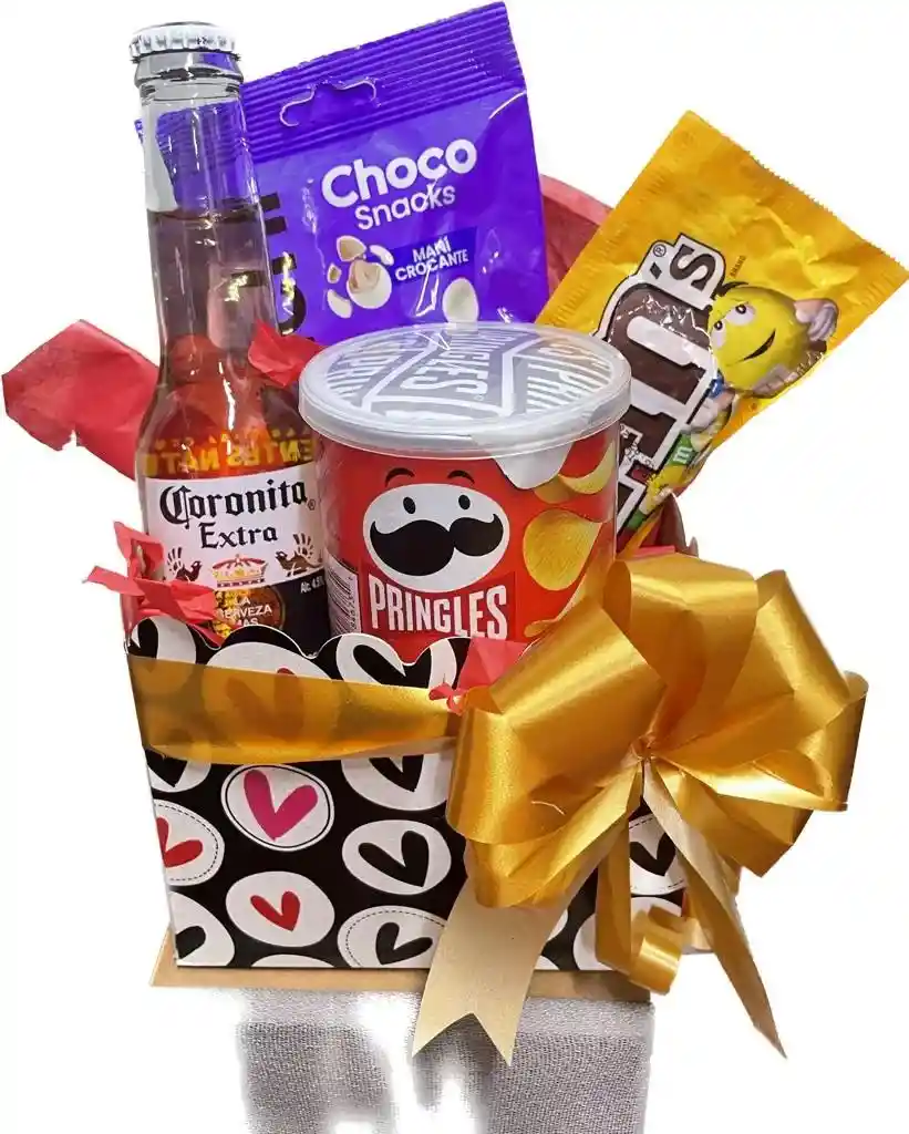 Caja te amo, contiene cerveza coronita, pringles, Bianchis y chocolates MM