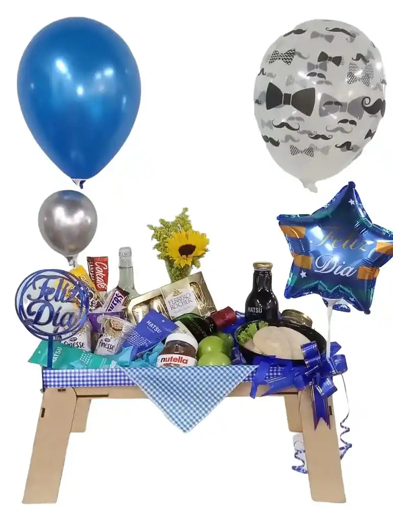 Mesa de desayuno Premium decorada que incluye: sándwich en pan artesanal, jamón pietran de cerdo, queso finesse, lechuga ( salsa showy), Botella de 375 Ml Buchanas 12 años, Mug decorado y sobre de Capuchino Vainilla, 2 Unidades de Bebida Hatsu (jugo de naranja opcional), fruta fresca ( kiwi. fresa, uvas) manzana verde, 2 Unidades de Maní hatsu (arándanos y almendras) Avena Finesse y Yogurt con cereal finesse, Frasco de Nutella pequeño, Caja de Ferreros Rocher X 8, Chocolates MM, Barra de Snicker, Masmelos en frasco, Solitario con Girasol o Rosas con decoración, globos y letrero de feliz día.