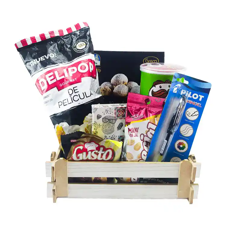 Detalle Regalo Feliz Día del hombre Llega esta fecha del año en la que tienes la oportunidad de resaltar lo importante que es para ti esa persona especial de tu vida, ya sea parte de tu familia, trabajo o amigos! El detalle incluye: *1 caja de madera *1 paquete de palomitas *1 paquete de maní saldo *1 tarro de papitas Pringles de crema y cebolla *1 caja de Kurabié *1 libreta *1 Bolígrafo gel negro 0.7 Blister Pilot *1 ponqué de chocolate relleno Mosaic Cake-Gusto