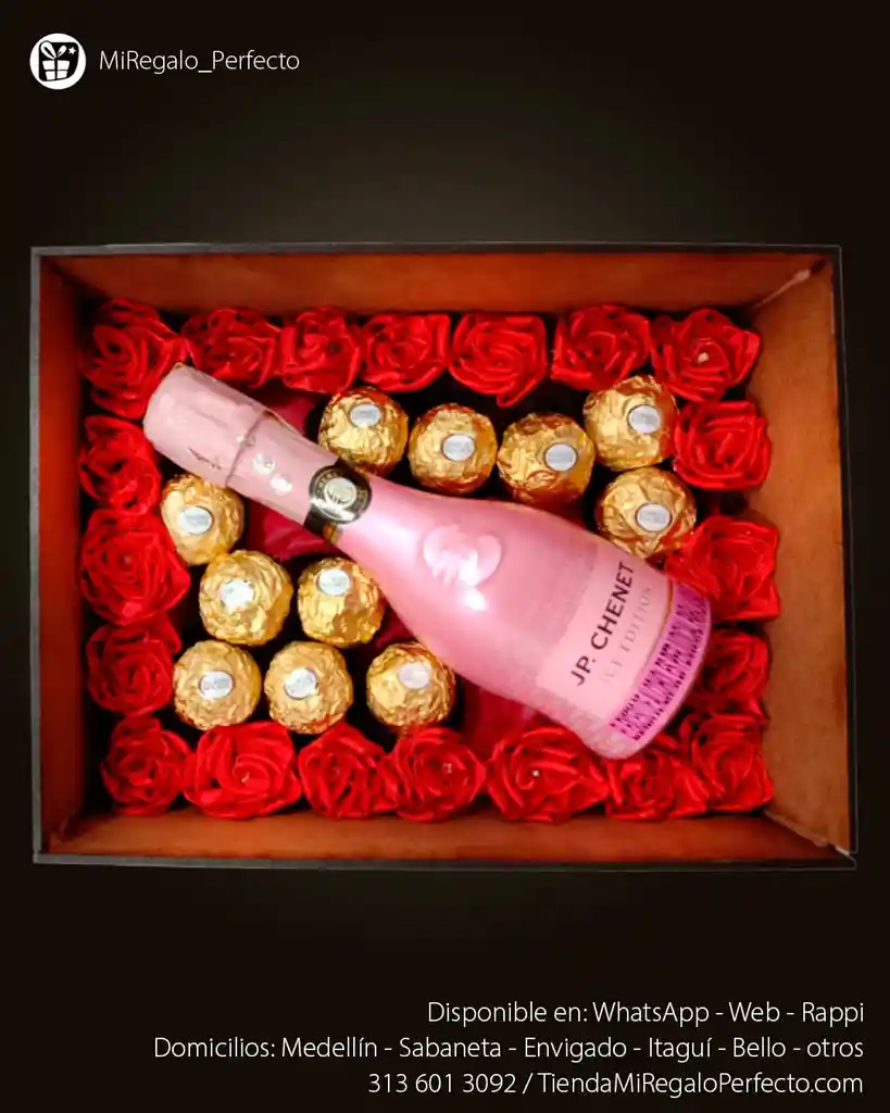 Regalo en cofre de madera con rosas eternas, viene aproximadamente de 20 a 25 rosas, Ferrero rocher x11U y piba de JP Chenet. Te incluye decoración a temática con cintas, moños y tarjeta personalizada