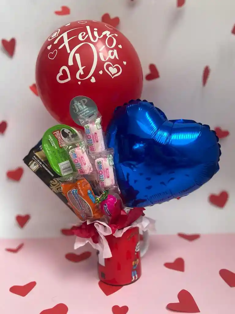 Sorprende con este detalle de amor y amistad a tu persona favorita Pocillo Mini ponque Papas Pringles pequeñas Cocosette Bonbonbum Masmelos Chocolatina Globo metalizado Bomba decorativa Frase personalizada ( Por favor escribir al WhatsApp 3144524281 la frase que desees)