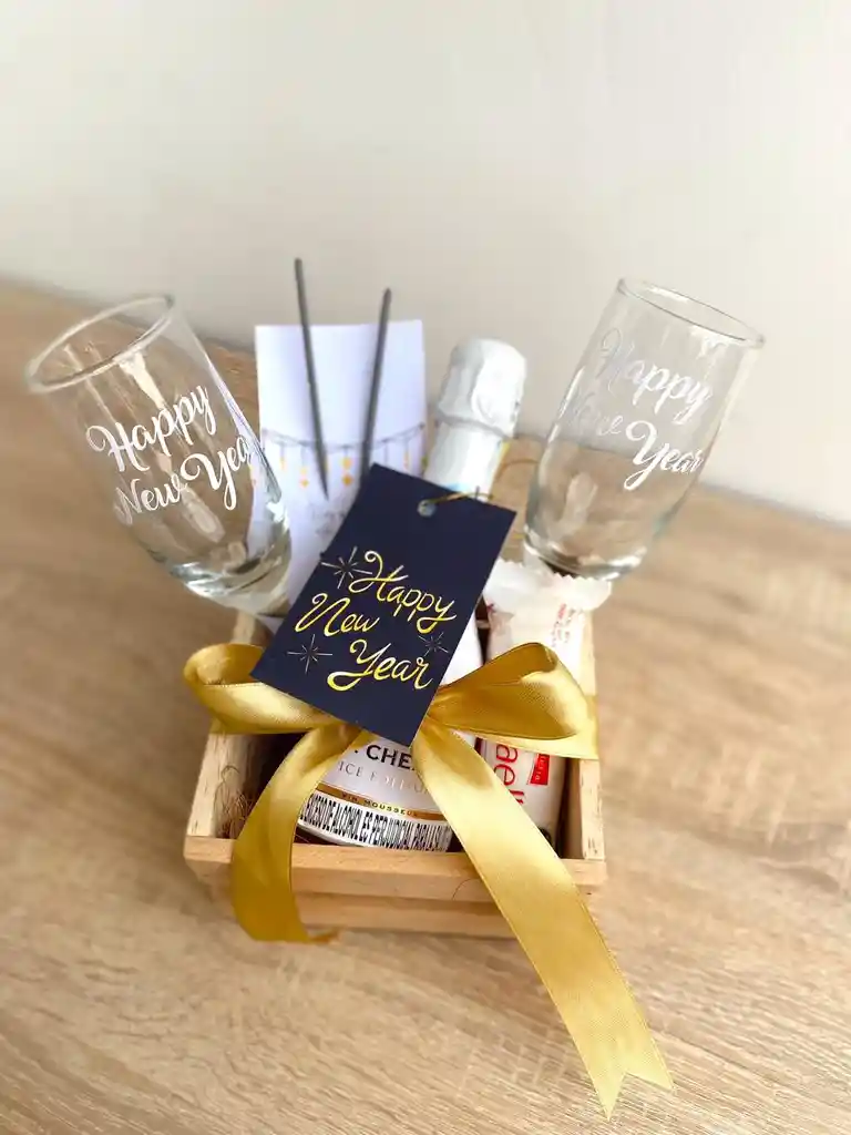 regalo para fin de año contiene: 2 coas de cristal marcadas Jp chennet de 200 ml dulce raffaello tarjeta con chispitas mariposas caja de madera decorada