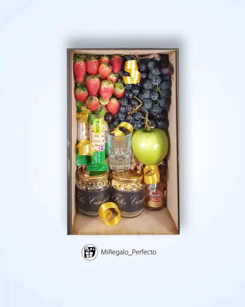 " Regalo en cofre de madera con frutas, fresas, manzana y uvas, botellita de cristal con frutos secos x2, barras de granola x3, 1 copa de cristal, 1 botellita de wisky personal. Te incluye su decoración a temática con cintas y moños, base y tarjeta personalizada."